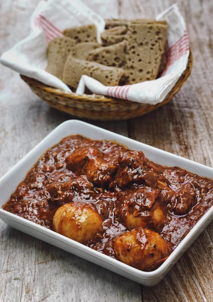 Our lunch arrives. It is very strange. My curry stew, murky brown with a quarter-inch layer of oil floating on top, tastes way too spicy for me. The famous bread I had heard so much about is spongy and thick, resembling a pancake on steroids with an unpleasant vinegary taste.