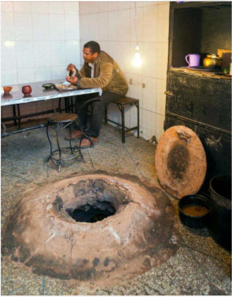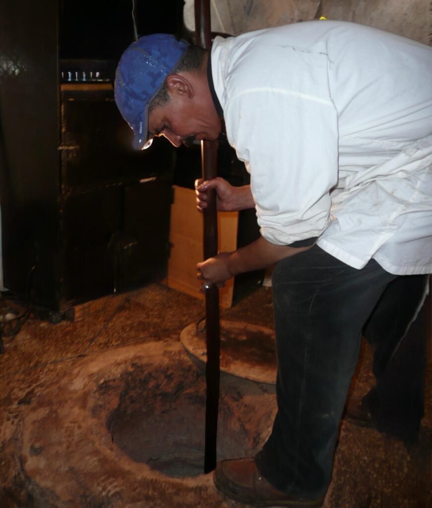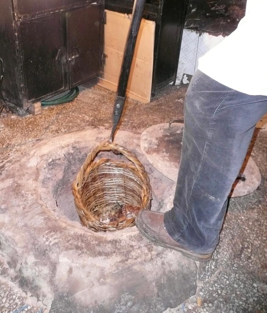 The restaurant oven is in the floor by the tables, 3 feet from where I sit. The oven is topped with a heavy lid that resembles a manhole cover. Periodically, the lid covering the blazing coal fire below is opened and using a hook on a long pole, baskets of fresh bread are lowered or raised. Whole lamb carcasses are placed into this oven, male lambs only, with testicles prominently displayed as the meat of the male is considered the most tender, I am told.