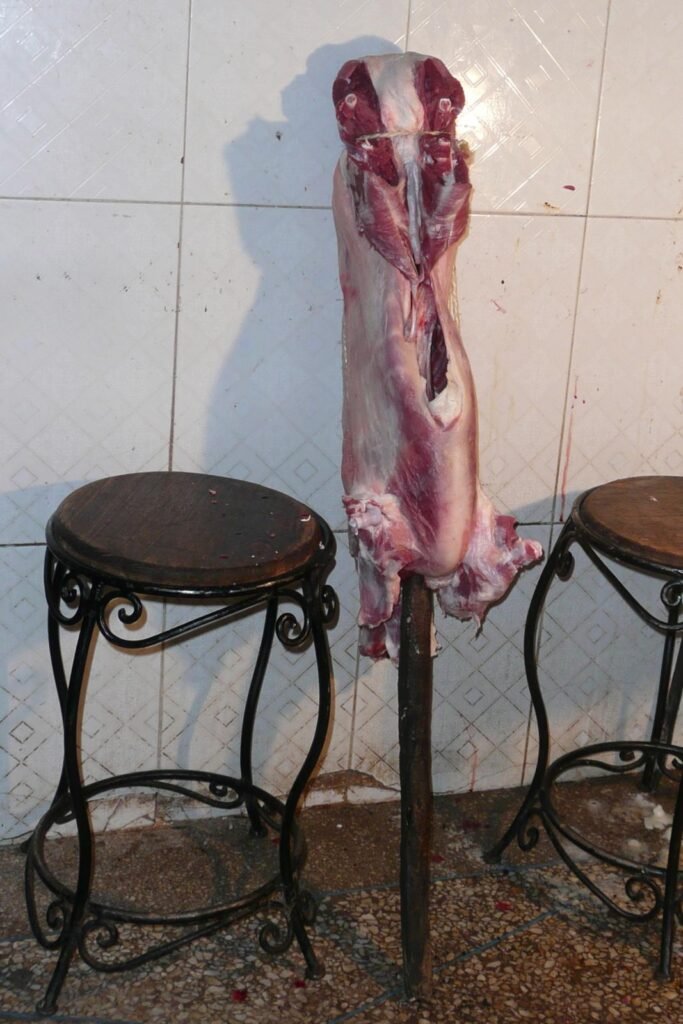 I AM EATING lunch at a small table in the back of a tiny little restaurant located in an alley off the massive lively square, the Jemaa el-Fnaa, in Marrakesh, Morocco. To call it a restaurant is a stretch of the imagination as only one dish is served here – roasted lamb called mechoui (mesh-wee).