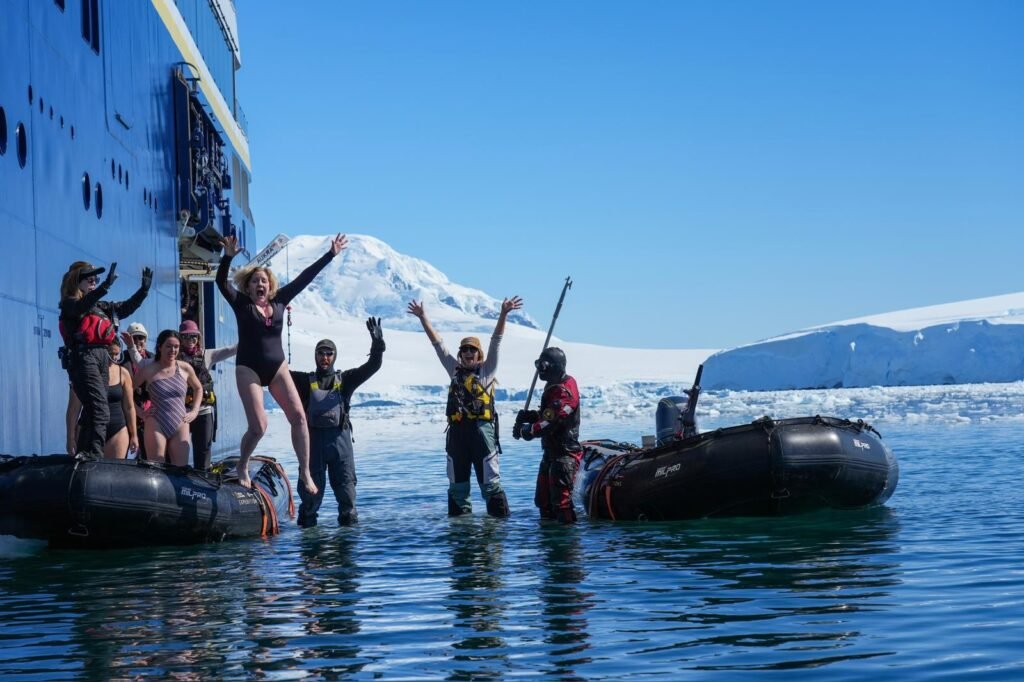I AM RUSHING to the point of entry for the polar plunge, a rite of passage of sorts onboard ships cruising Antarctica.  I am going to jump- willfully, voluntarily, intentionally- into the icy waters of the Antarctic Ocean.   This activity on my cruise ship is something that I have been eagerly awaiting but also dreading just a bit.  There were two sunny days that I thought for sure would be perfect for throwing myself into icy water, ideal for the ship’s polar plunge day, but the polar plunge was not scheduled on either of those two days.  Today, however, the sun is once again shining and sparkling on this cold frigid place at the bottom of the world.